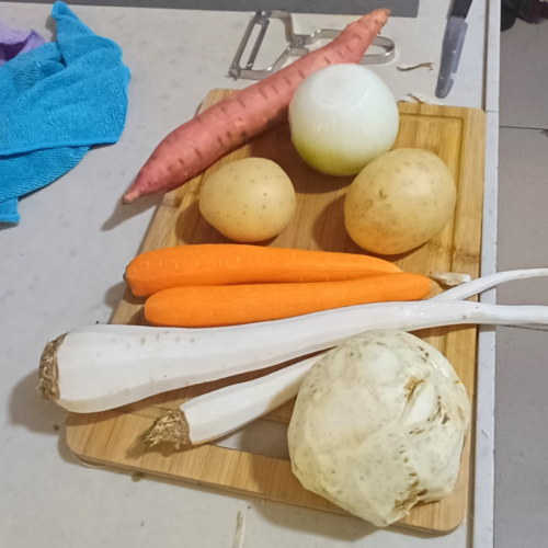 • Peel and cut the potatoes, sweet potato, carrots, parsnips, celery root, and onion into medium chunks. Peel the garlic cloves.